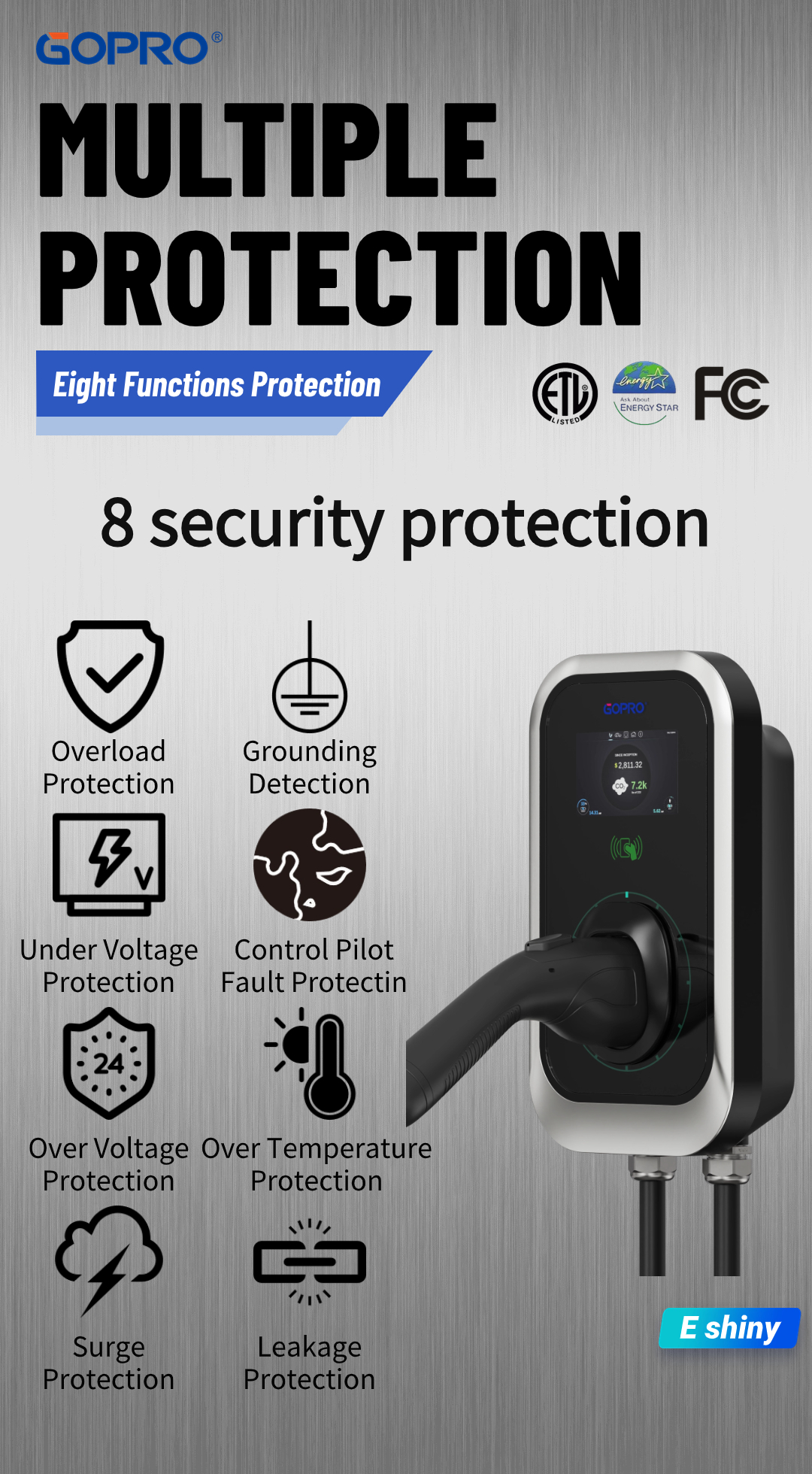 Tired of clunky, unreliable chargers that leave you guessing? Meet E-Shiny—the smart, sleek, and ultra-safe charging solution designed for drivers, businesses, and the planet. Here’s why it’s a game-changer:8-Layer Safety Armor (Because Peace of Mind Matters!)No more worrying about sparks or meltdowns. E Shiny’s advanced protection suite includes: Overload + Surge Protection Leakage + Ground Fault Detection Over/U...